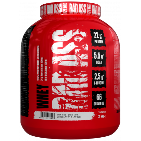 BAD ASS® WHEY. Zawiera substancje słodzące. Koncentrat białka serwatkowego w proszku do przygotowania wysokobiałkowego shake’a. Produkt polecany osobom aktywnym fizycznie o zwiększonym zapotrzebowaniu na białko. Białko przyczynia się do wzrostu masy mięśniowej.